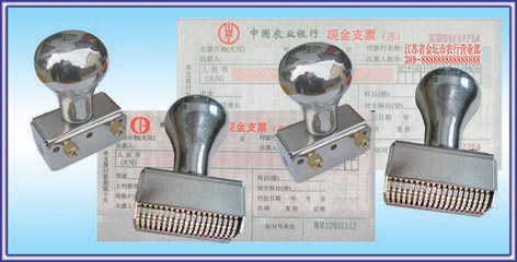 说明:此章根据金融界的要求设计,章体为不锈钢,日期为全铜结构,是银行下属网点对客户现金支票、转帐支票上加盖用,并可刻上银行名称,取代了每个客户都要一枚帐号章的历史,降低了使用成本,达到规范统一,位数18-26位。